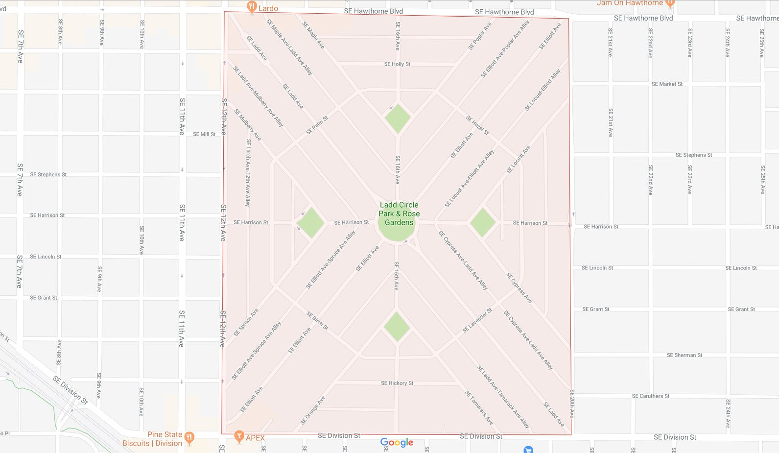 Ladd’s Addition is a unique historic district in the city of Portland that is known for its diagonal street pattern radiating from a central park spoke—the Ladd Circle Park & Rose Gardens. Ladd’s addition is named after the 19th century Portland mayor, William S. Ladd. This historic district is part of the Hosford-Abernethy neighborhood. The street layout is easy to spot from aerial maps of the city and clearly delineates the district’s boundaries.