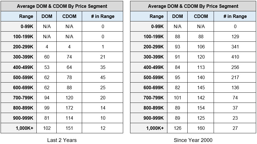 The following table more closely examines DOM as well as CDOM (cumulative days on market). CDOM is also an important metric as homes are often taken off the market and then subsequently relisted (typically at a lower price). The CDOM metric can give you a better idea of total expected marketing time. The table breaks out DOM & CDOM by price segment: