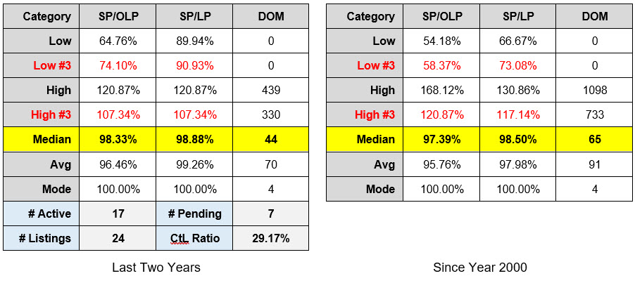 The “SP/OLP” label stands for “sales price/original list price” ratio. This is an important metric, as it shows what the particular property sold for relative to the original list price that was advertised. The “SP/LP” column tracks what the sales price was relative to the final published list price. This column, while not as important as the first one, still yields important insights as to the direction of negotiations. The “DOM” column tracks the days on market for all properties sold and listed and helps frame expected marketing time. Finally, the “CtL” label stands for “contract-to-list” ratio. It is the number of pending sales divided by the total number of listings. A low ratio means many properties are sitting on the open market waiting for offers. A high ratio indicates properties are being absorbed by the market quickly, commonly referred to as a “seller’s market.”