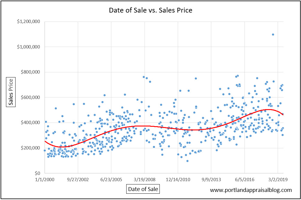 The following scatter plot shows all closed-sale detached single-family residences (with a red trendline):
